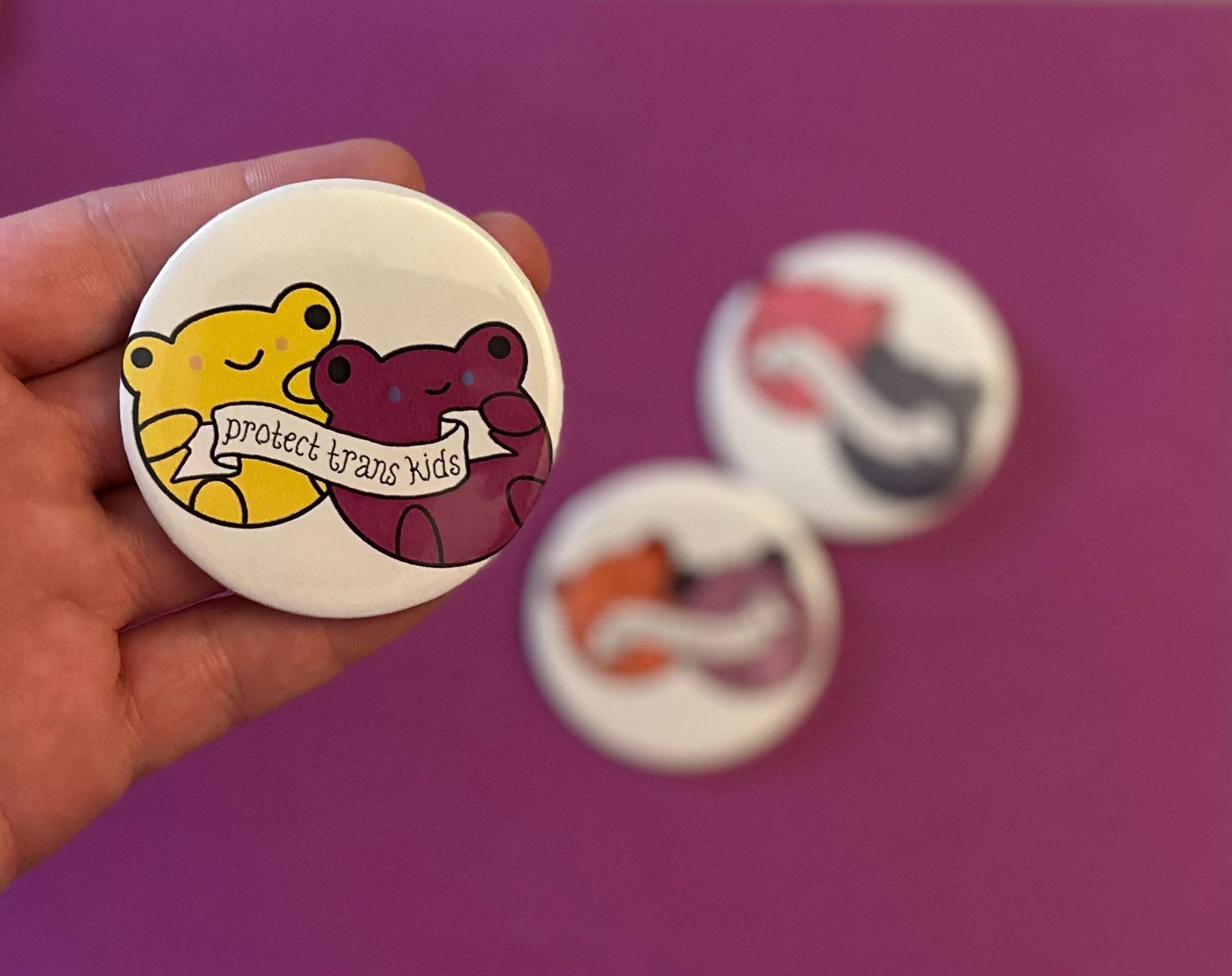 Frogs inspired by flag colors with a banner that reads "protect trans kids"